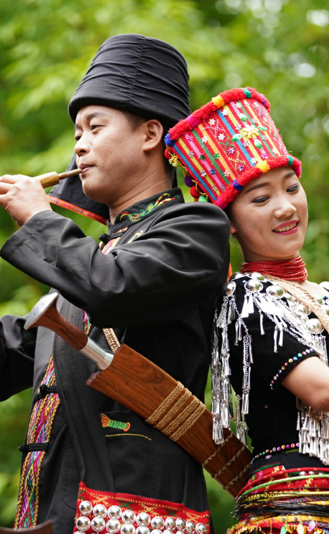 云南壯族主要聚居在文山州,人口114萬,民間的村寨大多依山傍水。壯族擅長種植水稻,有太陽崇拜和長老崇拜的風俗,視銅鼓為重器,厚愛銀飾,善烹制五色花米飯,能歌善舞,熱情好客。進入景區(qū)壯族村,迎面有祭祀龍王的龍柱,兩邊是先民繪制的天王崖畫和為紀念傳說洪水泛濫時幫助先民度過劫難而建的石葫蘆亭。祭祀玉皇大帝的昊天閣和傳說能驅邪納福的碩大銅鼓聳立在廣場兩側。桿欄式和麻欄式民居、壯族青年社交休憩的“情廊”、村...